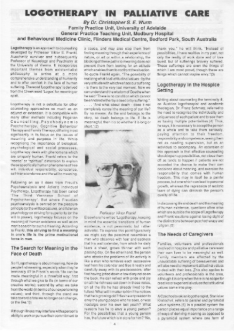 - Wurm, C. S. E. (1992). Logotherapy in Palliative Care. Hospress 6(1):4-5.