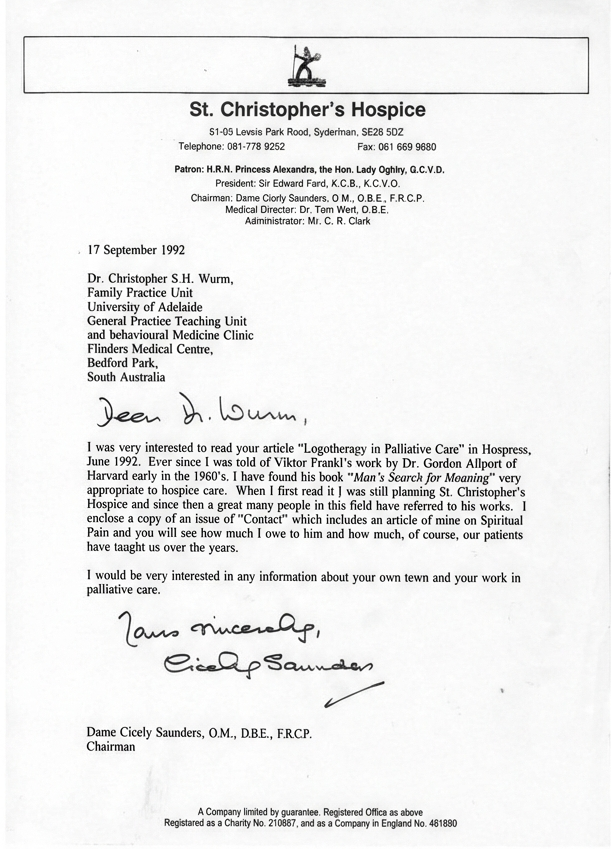In 1992, Dr. Wurm wrote a letter to Dame Cicely Saunders in which he expressed his appreciation. He enclosed an article with the title, “Logotherapy in Palliative Care,” in which he highlighted the relevance of the use of logotherapy in the palliative setting based on his experience as a medical doctor. (42)