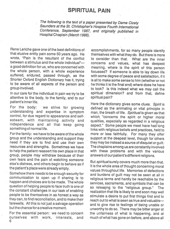 - Saunders, C. (1991). Spiritual Pain. Contact. The Hospice Movement. No 122, October 1991, Pages 6-9. Shared with permission from Dr. Wurm.